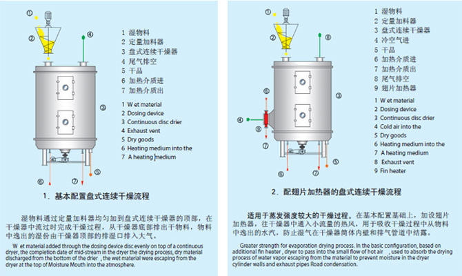 盤式連續干燥器是一種高效的傳導型連續干燥設備。其獨特的結構和工作原理決定了它具有熱效率高、能耗低,占地面積小、配置簡單、操作控制方便、操作環境好等特點,廣泛適用于化工、醫藥、農藥、食品、飼料、農副產品加工等行業的干燥作業。在各行業使用實踐中深受好評。現生產制造常壓、密閉、真空三大類型、1200、1500、2200、3000四種規格,A(碳鋼)、B(接觸物料部分均布不銹鋼)、C(在B的基礎上,增加蒸汽管路、主軸及支架為不銹鋼,筒體和蓋頂內襯不銹鋼)。三種材質,干燥面積4~180m 2,共幾百種型號的系列產品,并能提供與之相配套的種輔助設備,可滿足用戶對各種物料進行干燥的需要。